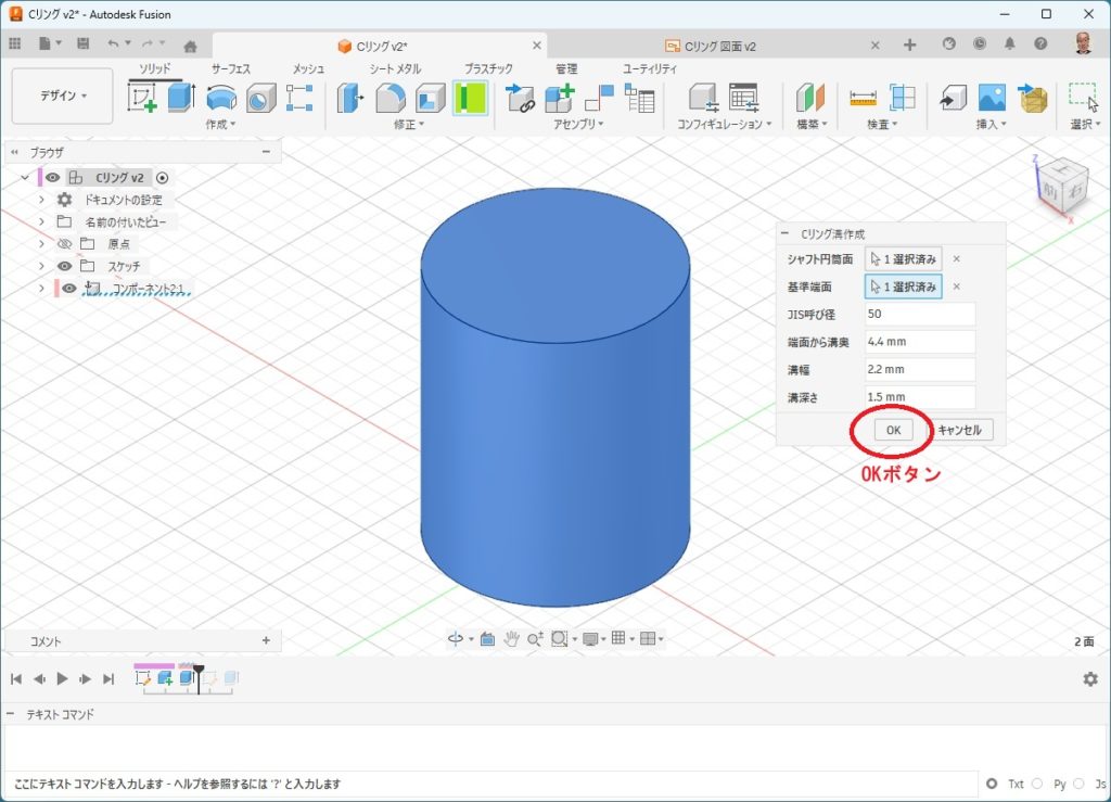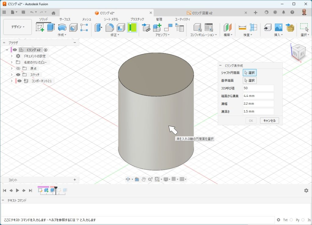 円筒面と端面を選ぶだけでCリング溝を作成できる